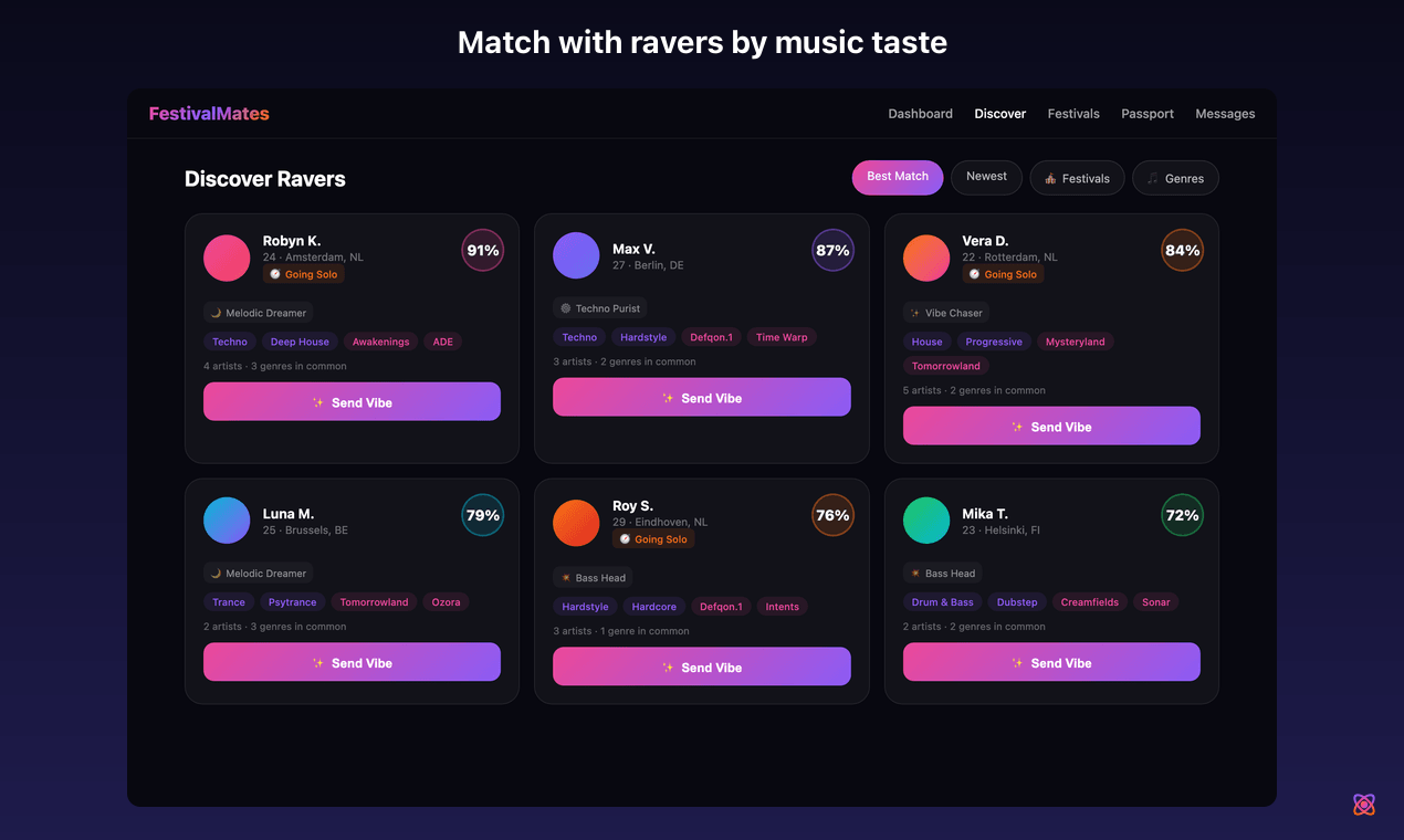 FestivalMates is built solo, evenings and weekends, with Next.js, Supabase, and the Spotify Web API. Every Mate Score comes from real listening data (60% shared genres, 40% shared artists) — no self-reported interests, no guessing. The platform launched in private beta in early 2026 and opens publicly on Product Hunt in April 2026.